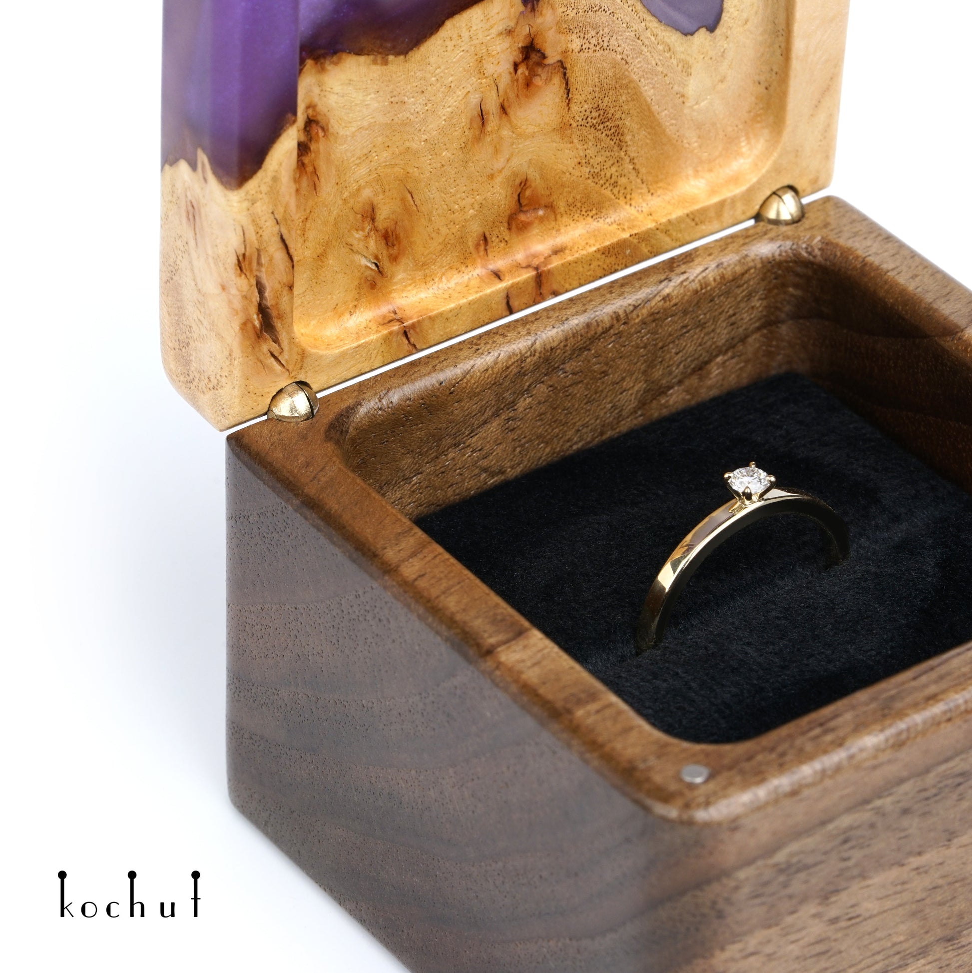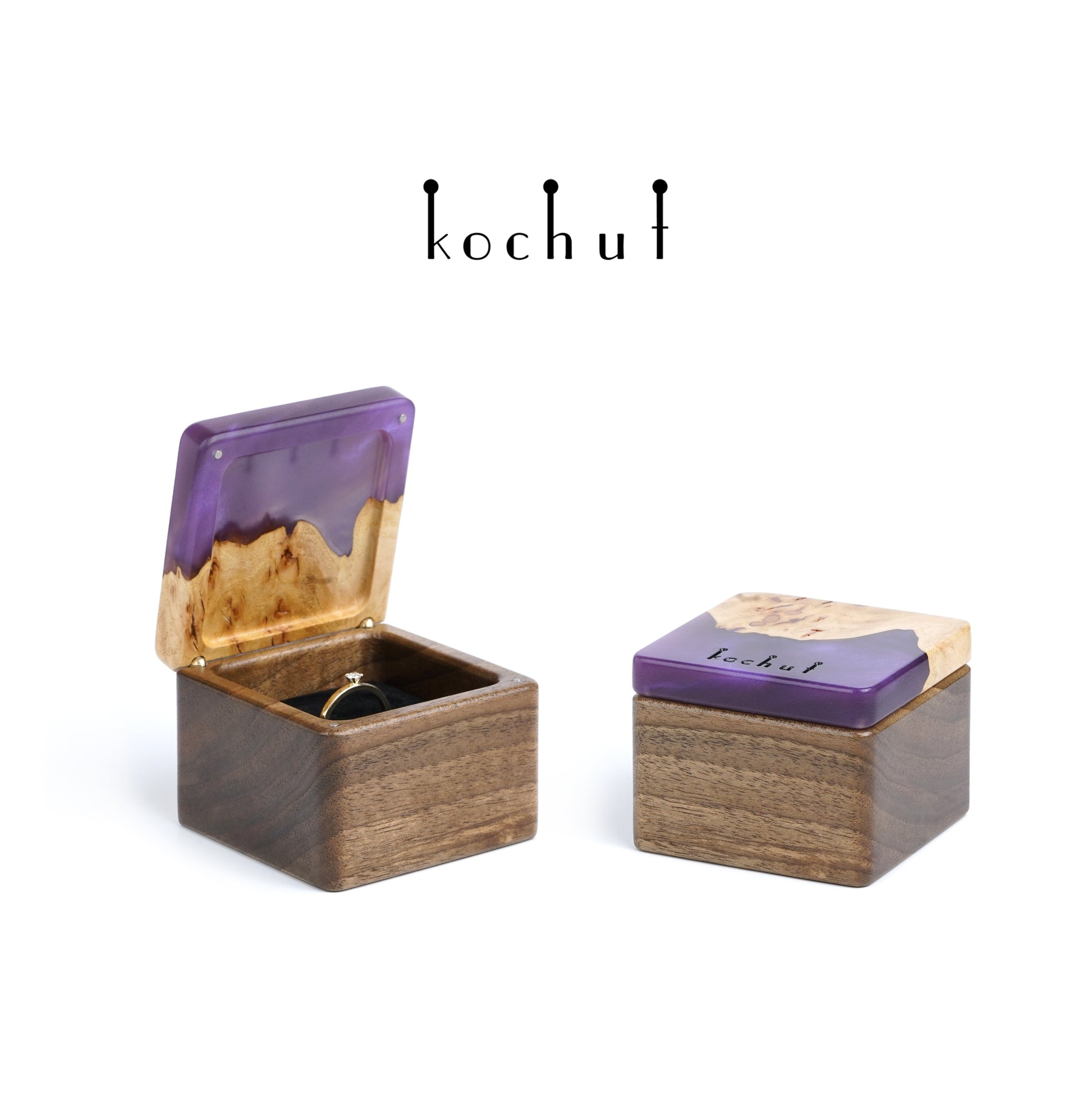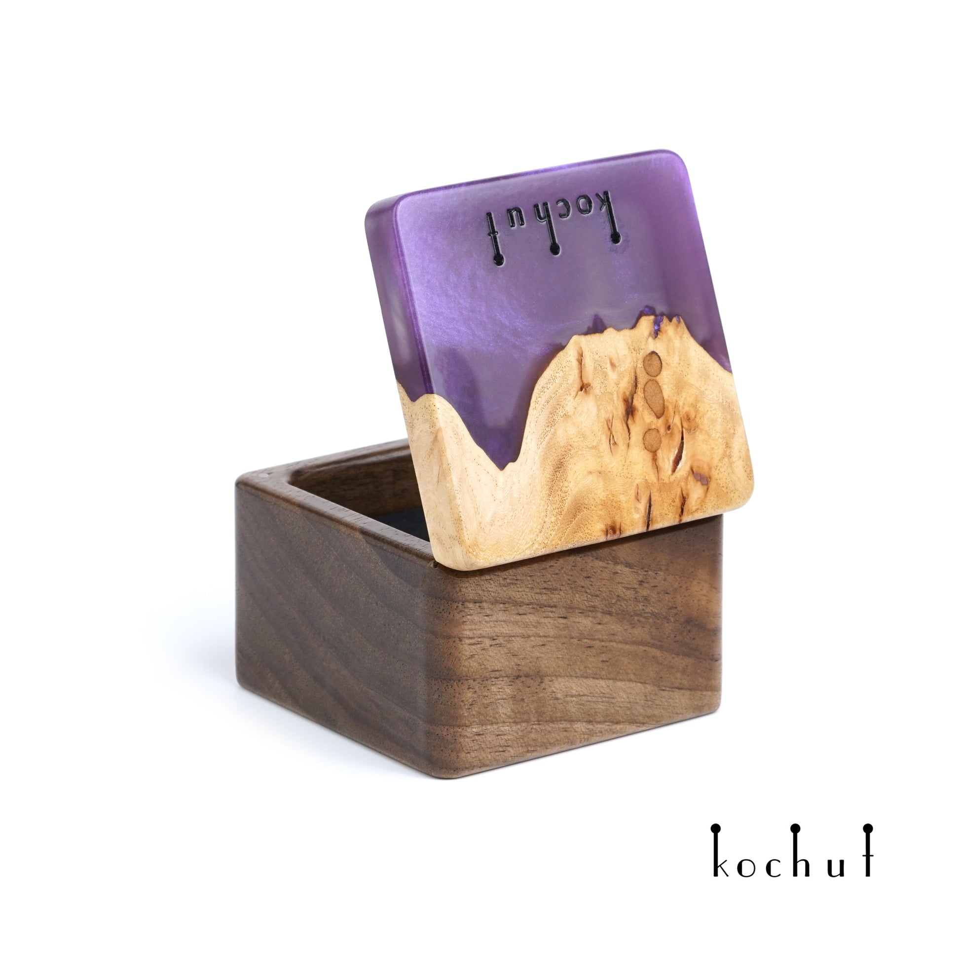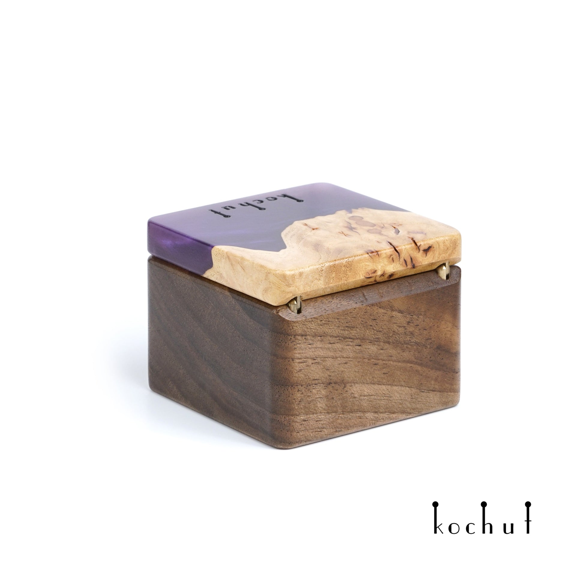Quadrum — Schmuckkästchen aus Walnuss, Ulme und lila Epoxidharz