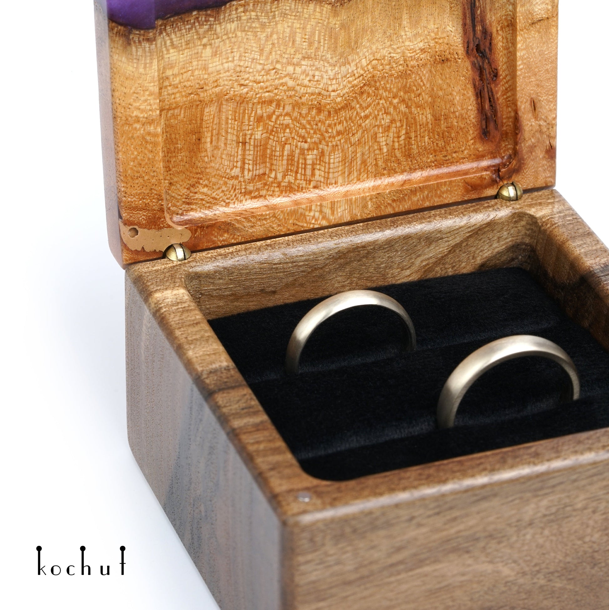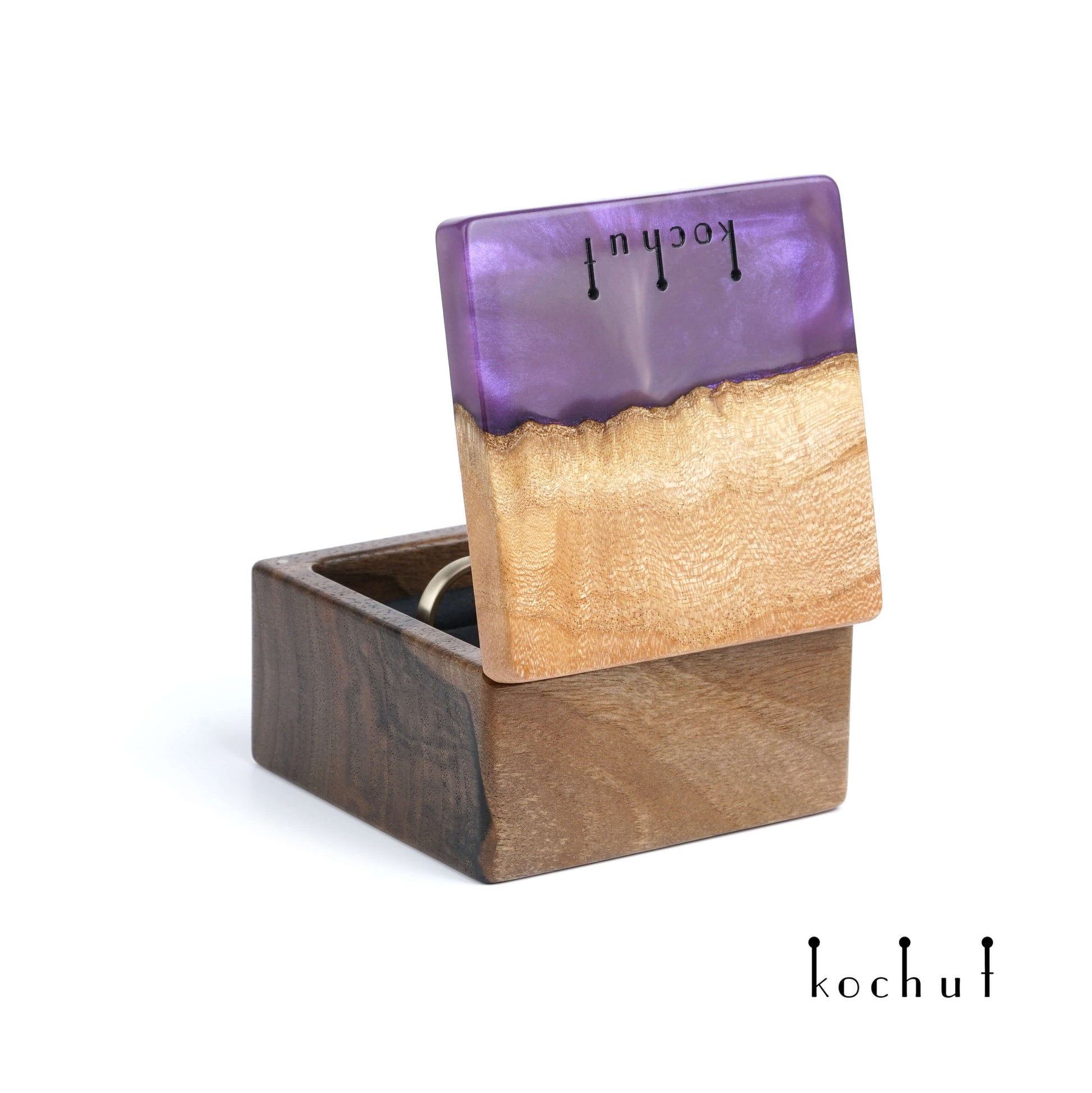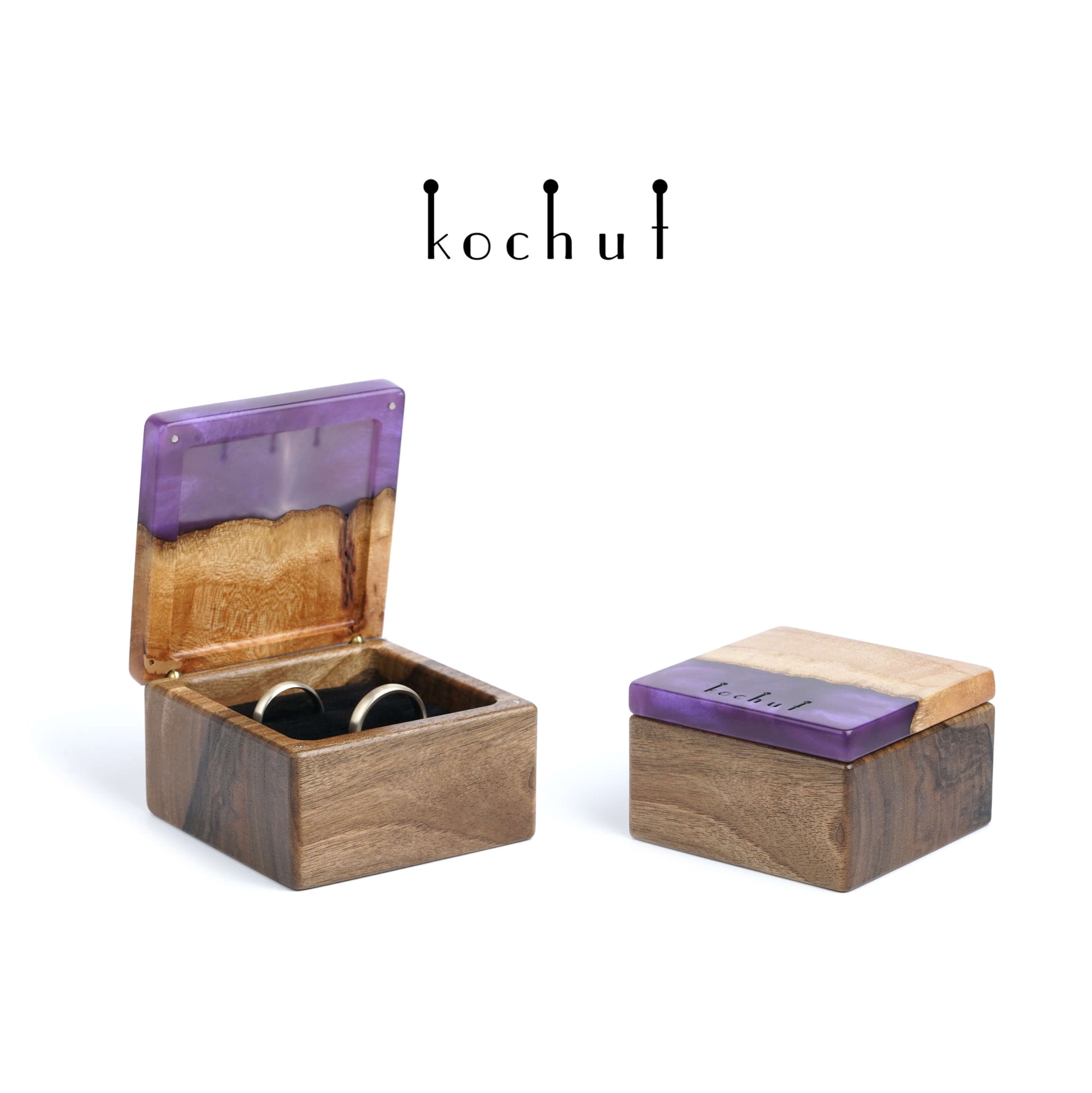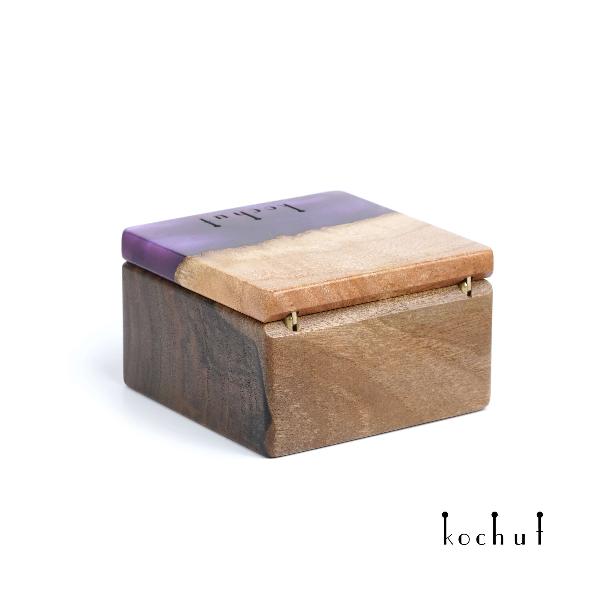 Quadrum — Schmuckkästchen aus Walnuss, Ulme und lila Epoxidharz